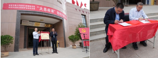 党委与榜罗镇会议纪念馆举行合作签约仪式。马忠与陈鹏鸣共同为教育实践基地签约、揭牌,陈鹏鸣受聘为课程思政校外合作教师。新闻系党支部书记李巨星主持仪式。
