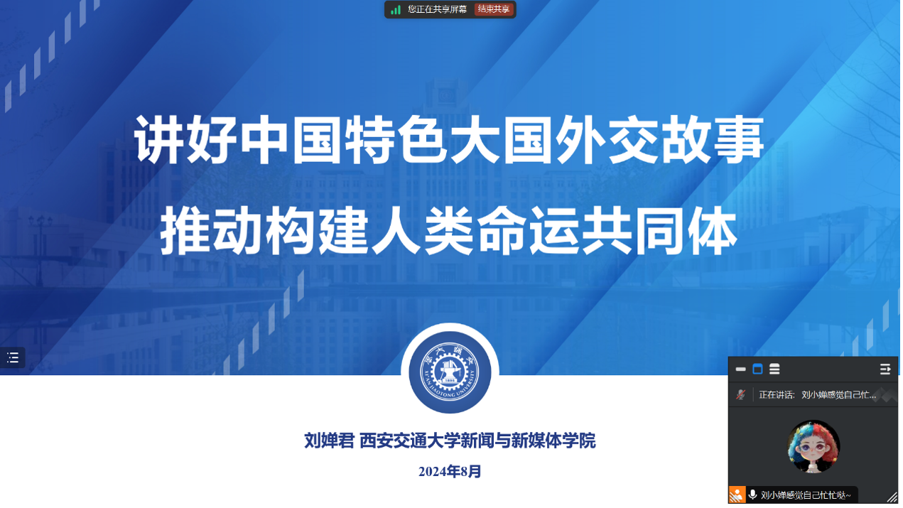 刘婵君以“讲好中国特色大国外交故事,推动构建人类命运共同体”为主题进行领学。在回顾我国一系列大国外交事件后,梳理和解读了自信自立、开放包容、公道正义、合作共赢的中国外交方针原则。她认为,在充满挑战和机遇的外交环境下,新闻传播学科学者和媒体应立足于人类命运共同体理念,做到在多元叙事中扩大信息传递、在交互融通中促进价值传通、在外事报道中讲好外交故事,更好地诠释习近平外交思想的丰富内涵,服务中国特色大国外交的战略发展,向世界人民讲述波澜壮阔、精彩纷呈的中国外交故事。