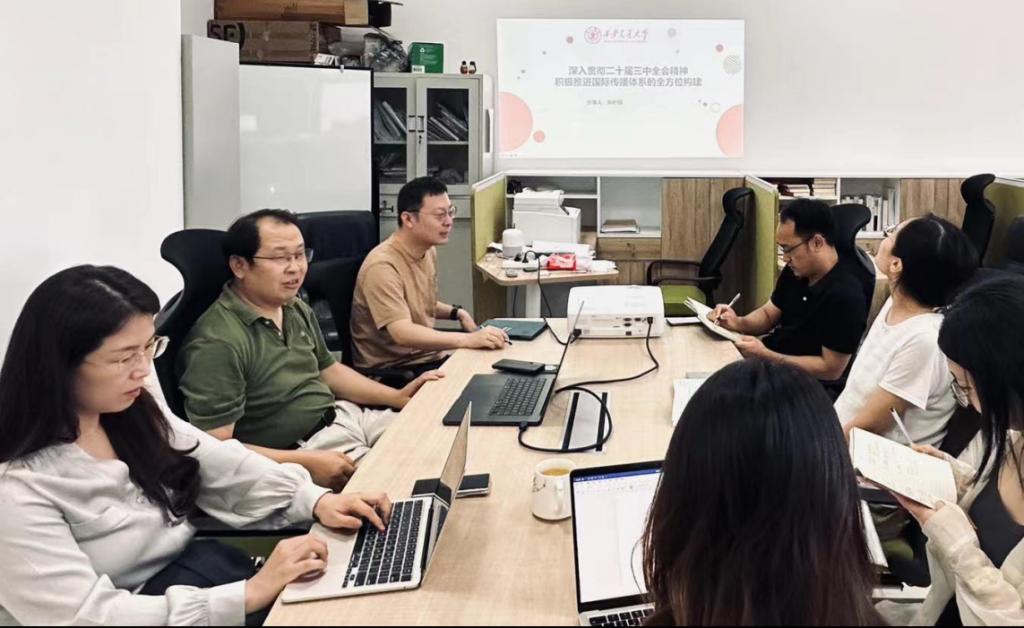 陈积银进行了题为《深入贯彻二十届三中全会精神,积极推进国际传播体系的全方位构建》的分享学习。他首先回顾了党的二十届三中全会关于推进国际传播格局重构的重大战略部署,包括“加快构建多渠道、立体式对外传播格局”“加快构建中国话语和中国叙述体系,全面提升国际传播效能”“扩大国际人文交流合作”等,并结合当前国际形势分析了我国在国际传播中面临的挑战与机遇。