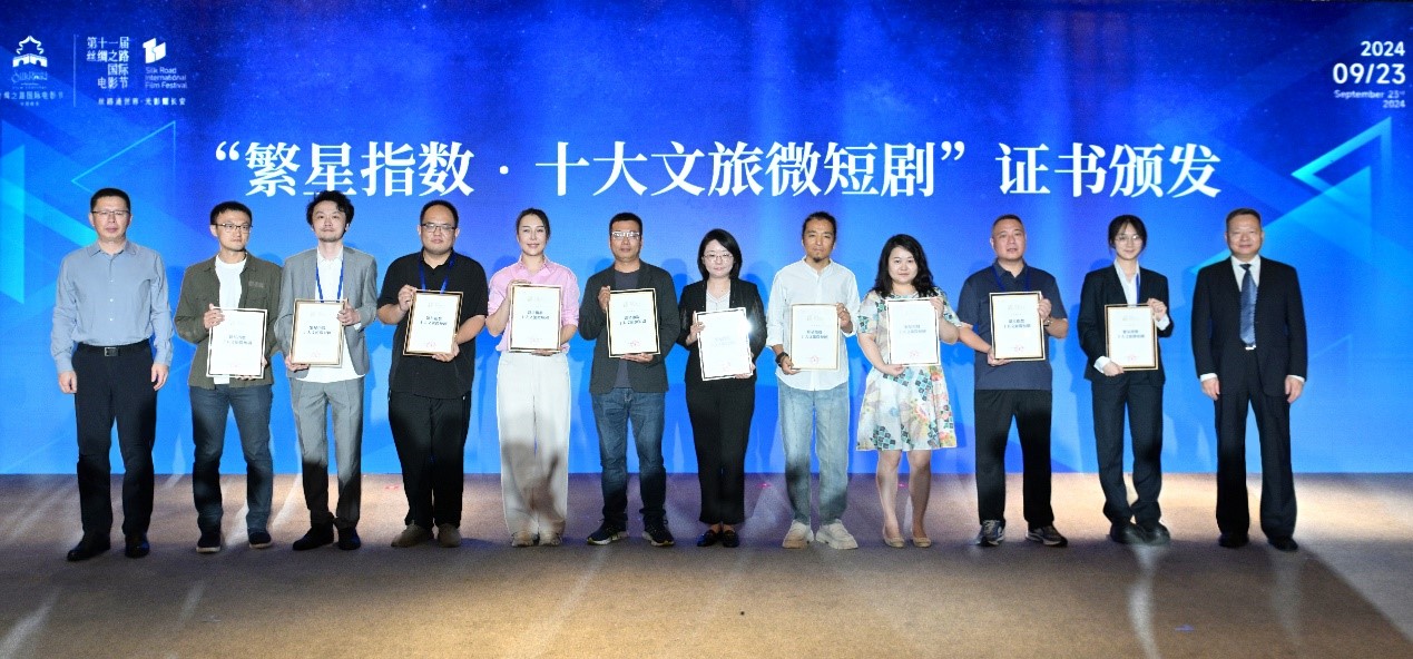 国家广播电视总局网络视听节目管理司副司长杨铮,陕西省委宣传部副部长、陕西省广播电视局局长武勇超为“十大文旅微短剧”获评剧目代表颁发证书。