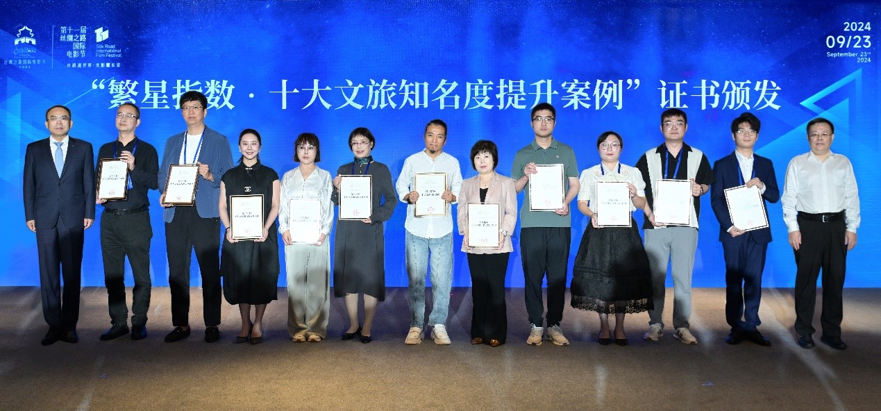 中广联合会副会长兼秘书长黄炜,陕西省文化和旅游厅厅长高阳为“十大文旅知名度提升案例”获评代表颁发证书。