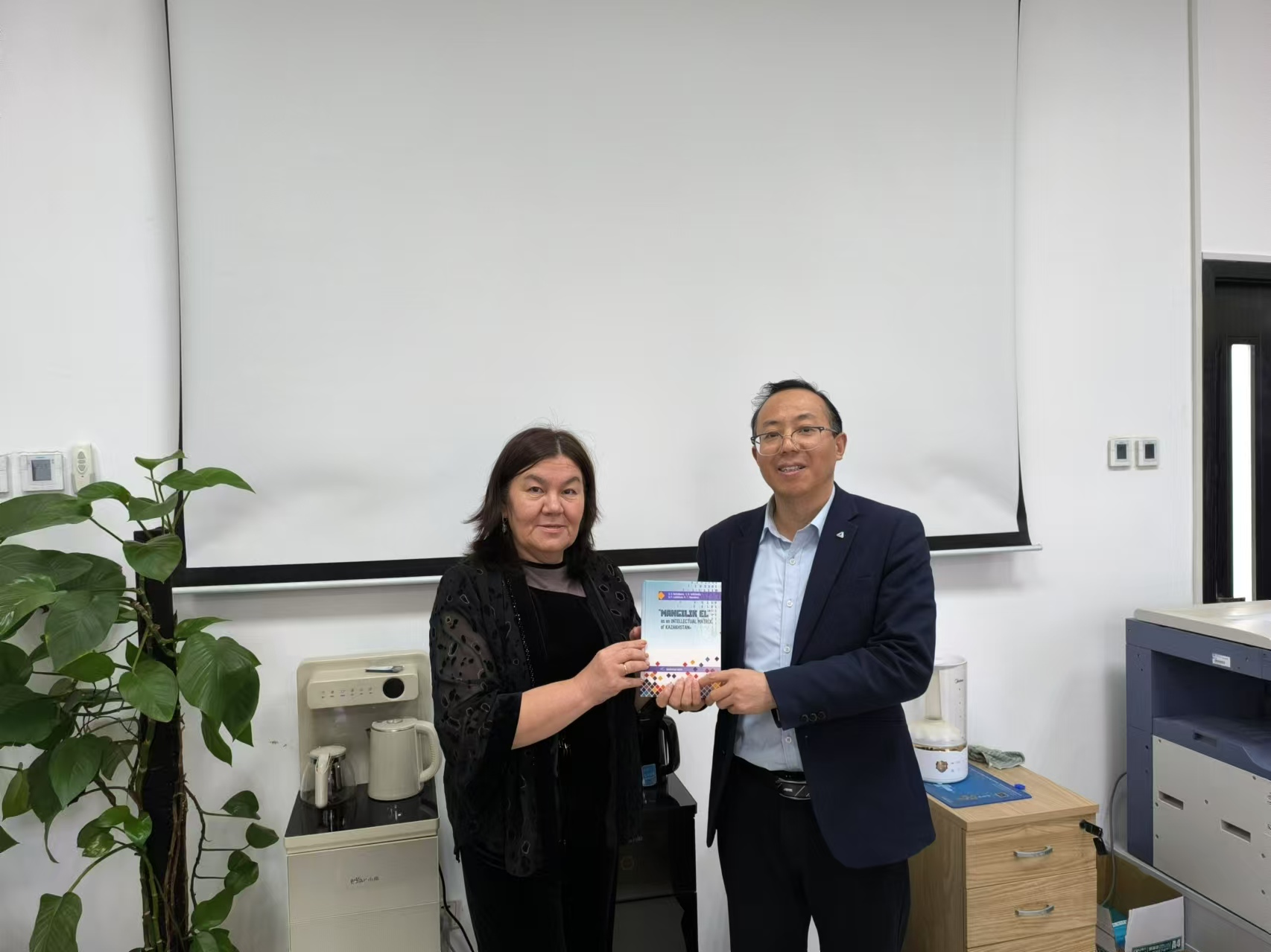 讲座最后,为进一步探索合作机制,吴锋教授就加强双方的学术合作、留学生工作等方面展开交流探讨,希望通过“丝绸之路大学联盟”等国际合作平台,与中亚各高校建立常态化的学术交流与人才培养机制。他表示,数据新闻学作为新闻教育的新兴领域,对于培养具备数据素养和新闻专业技能的复合型人才具有重要意义。学院愿意与中亚地区的高校共享资源,举办研讨会和工作坊,以及开展联合研究项目。对此,古力米拉·苏尔丹巴耶娃教授表示认同,并将进一步推动实施具体流程,包括制定合作框架,确定合作项目,以及推动学生和教师的交流互访。会后,作为加深双方友谊与合作的象征,吴锋教授与古力米拉·苏尔丹巴耶娃教授举行了赠书仪式。