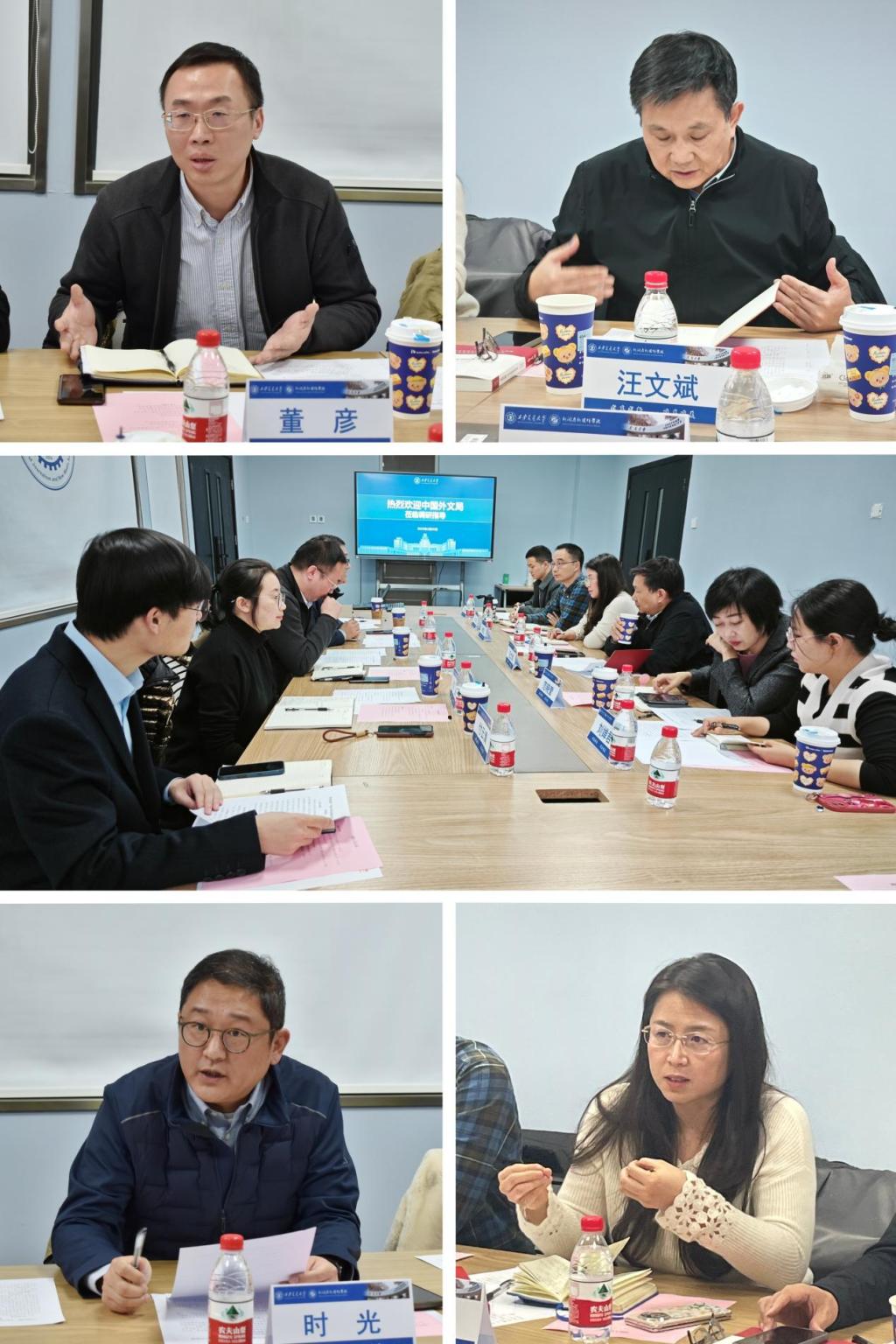 院长汪文斌、副院长孙鹤立,院长助理范晓莹,新媒体系主任陈强,国际传播系主任刘婵君,国际传播系教师王威力参加座谈。汪文斌院长主持调研座谈会。