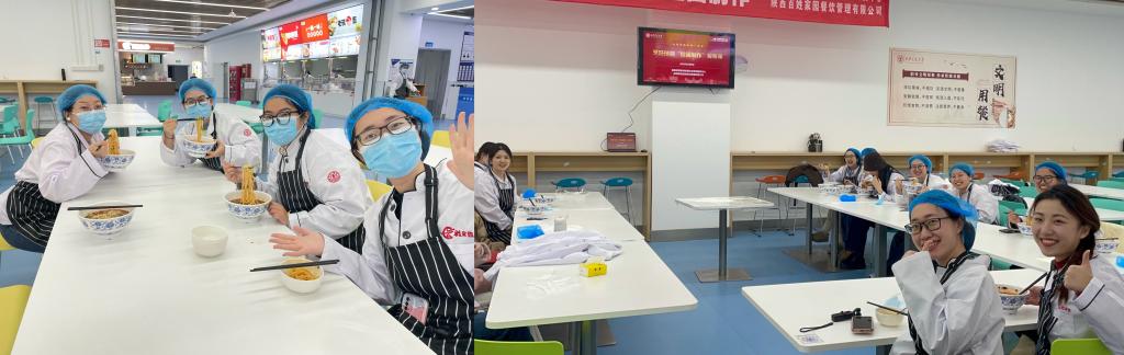在实践环节,同学们紧循之前所学的操作要领,全神贯注地投入到拉面制作过程中。起初,大家手法略显生疏,但在拉面师傅的耐心指导下,同学们渐入佳境,逐步掌握了拉面技巧。在后厨工作人员的帮助下,同学们亲手制作的拉面纷纷下锅烹煮,随着一碗碗拉面端出后厨,大家品尝到了这份饱含自己劳动的美味成果。