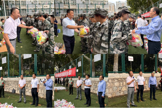 随后,老师们走到新生队伍中,为同学们发放精心准备的慰问品,每一份慰问品都承载着学校对新生的关怀。同时,老师们也向辛勤付出的教官们送上了慰问品,对他们的专业指导与悉心教导表示感谢。