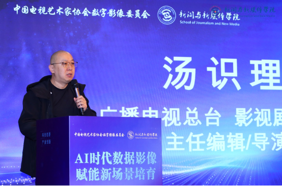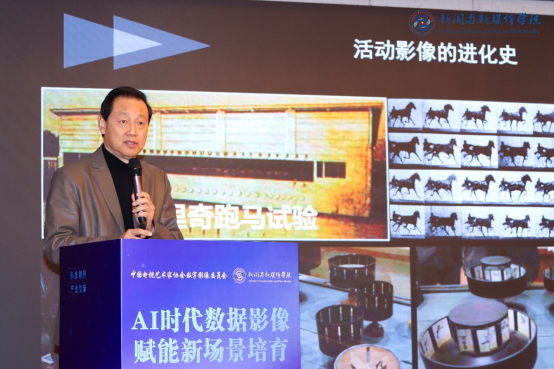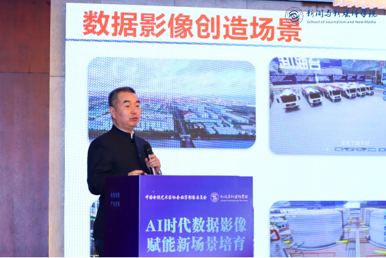 中国传媒大学动画与数字艺术学院教授张歌东梳理了影像发展的四大阶段,从模拟影像、数字影像、虚实结合影像到AI时代的“高维影像”,提出影像已实现从视网膜感知到大脑认知的升维突破。他聚焦空间叙事理念,通过VR大空间应用、媒体建筑光影景观等案例,探讨了数据影像在跨屏创作、公共空间体验等领域的创新可能,呼吁加强技术艺术交叉人才培养。