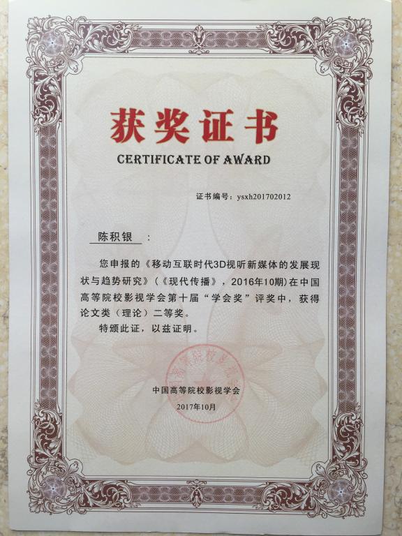 在9月17日上海举办的中国高等院校影视学会第十届“学会奖”论文评奖中,我院陈积银教授荣获大奖。陈教授此次获奖的论文为《移动互联时代3D视听新媒体的发展现状与趋势研究》。该论文系其主持的国家社科基金《我国3D电视产业国际规制借鉴》(13CXW012)的阶段性成果。