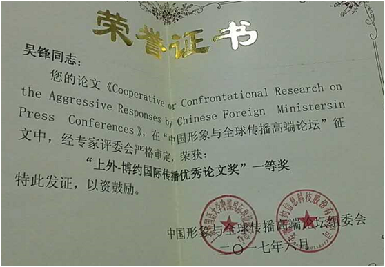 吴锋教授递交论文《Cooperative or Confrontational? Research on the Aggressive Responses by Chinese Foreign Ministers in Press Conferences (1996–2016)》。经过匿名专家严格评审,并经主办方审定:吴锋教授的论文荣获本次论坛唯一的一等奖,获得主办方颁发的荣誉证书,并获相应的奖金。