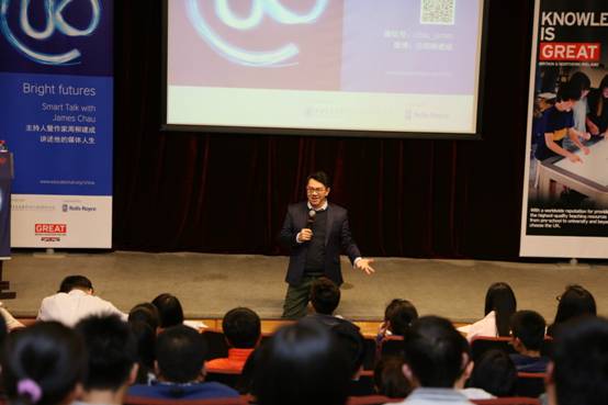 周柳建成(James Chau)是央视主持人中少数几位出生成长在海外的华裔,成长于英国,毕业于皇家音乐学院和世界著名学府剑桥大学,著名作家,联合国亲善大使。作为CCTV-9的特约撰稿人与主持人,他曾采访过政治、经济、与艺术界的众多重要人物,讲座开始前,通过一段他采访温妮·曼德拉、罗伯特·穆加贝及中国第一夫人彭丽媛等多位全球知名人士的剪辑视频,简要地展示了他的媒体经历。