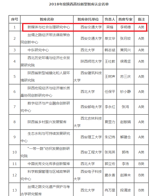 李明德院长任首席专家,吴锋教授负责的“新媒体与社会治理研究中心”智库成果获批陕西高校新型智库A类。