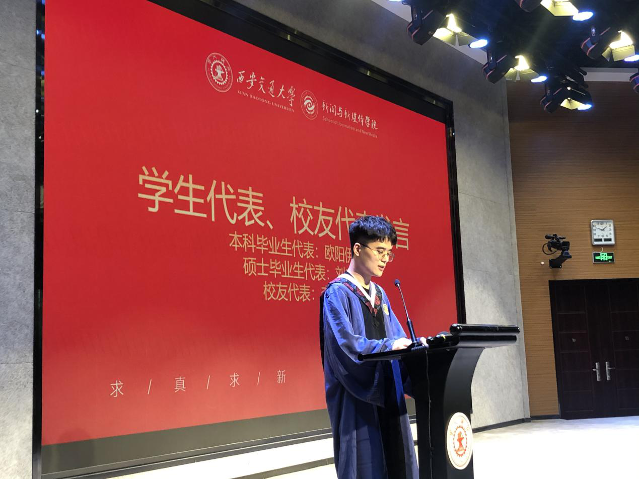 李明德院长宣读学校授予研究生毕业生硕士学位、本科生毕业生学士学位的决议,并公布优秀毕业生、优秀毕业生干部名单。本科优秀毕业生代表欧阳伊萱同学发言,她曾赴墨尔本大学交流担任墨尔本大学社交媒体大使之一,也曾在联合国担任实习生,未来她将在伦敦政治经济学院继续攻读传媒专业。她立志学成回国后身体力行地为祖国和海外沟通搭建桥梁,同时表示无论未来在哪里,都将继续践行“精勤求学、敦笃励志、果毅力行、忠恕任事”的校训与勤朴踏实的作风,做一个合格的交大人。
