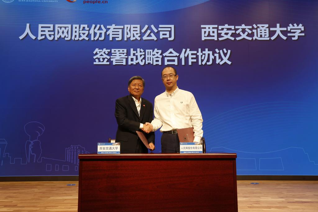 9月21日,人民网与西安交大战略合作协议签约仪式暨传播内容智能理解研究中心揭牌仪式在中国西部科技创新港举行。人民网党委书记、董事长、总裁叶蓁蓁,西安交大校长王树国分别代表双方签署战略合作协议,双方将在人才培养、科学研究、舆论引导、平台建设等方面合作共赢,为人民网转型科技型、智慧型企业和西安交大建设中国特色世界一流大学提供有力支撑。签约仪式由西安交大党委常委、宣传部部长成进主持。