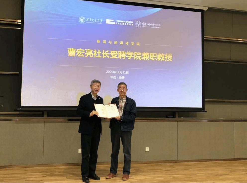在热烈的掌声中,张迈曾书记向曹宏亮老师颁发兼职教授聘书,并为曹老师佩戴91传媒
