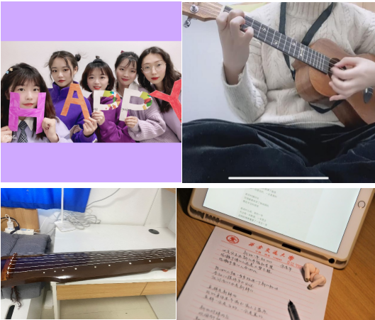 排除了平日里的干扰因素,疫情之下的封闭生活也为个人重拾爱好提供了时间契机,开始弹琴静心、拼装乐高;和室友一起装扮宿舍、拍照留念,度过愉快的跨年夜;在宿舍练习尤克里里、拍摄短视频,分享生活并充实生活;赛博空间里的信息纷繁复杂,关于西安的各类信息裹挟着每个置身其中的人,越刷越焦虑,有同学开始放下键盘、拿出纸张、开始练字静心,相信枯燥重复的日子也有意义,期望最后一页是花开万里。疫情缩小了活动半径,但也减少了外部干扰,同学们都表示很珍惜这段与自己自洽的相处时光。