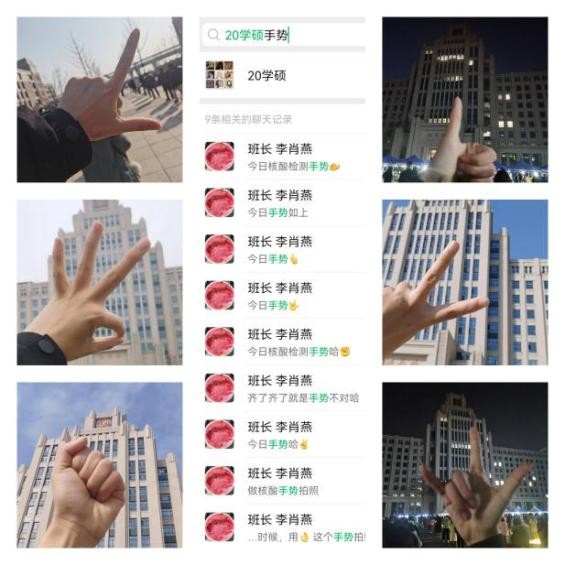 硕0192班在班长的带领下,每日在确保按时、有序进行核酸检测的同时,开展群内“花样打卡”活动,使核酸检测不再枯燥,并成为封校后同学们互相鼓励的正能量。