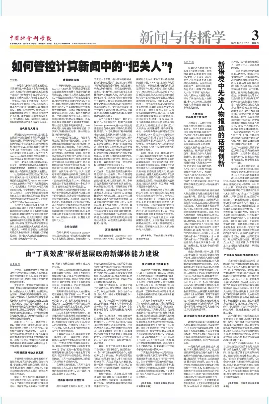 计算是当代新闻实践的重要特征。计算新闻这一概念自本世纪初被提出以来,其理论和内涵伴随新技术的出现一直处于不断发展和丰富之中。如今它涵盖了从聊天机器人和推荐系统,到人工智能(AI)和原子化新闻等一系列应用在新闻业中的信息技术。这些技术已被业界广泛应用于新闻的采编、制作和分发。数据、算法和软件正在成为当代新闻的重要组成部分,这里我们统称它们为机器。毫无疑问,机器正在取代人力,至少是部分取代。与此同时,选择和控制新闻传播的把关人也在发生变化。
