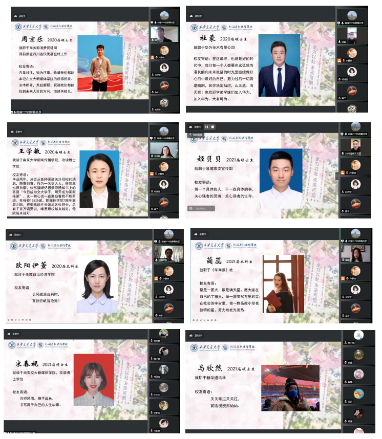 此次座谈会以线上形式举行,邀请到了知名校友、西安博达软件股份有限公司董事长魏小立先生,知名校友、美林数据技术股份有限公司董事长程宏亮先生,以及优秀毕业生周京乐、杜蒙、王学敏、姬贝贝、宋春妮、马欣然、欧阳伊萱、蔺蕊等8名校友。91传媒