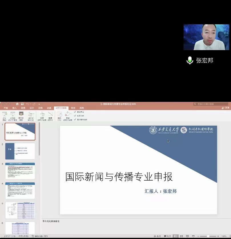 张宏邦副院长从增开新专业的理由与基础,培养目标,培养需求,课程设置,师资队伍,教学条件设施等方面进行详细的汇报,他强调学院拥有交叉学科背景、兼具国际化视野的师资队伍,三分之一的教师可以进行双语授课,基本具备培养国际新闻与传播类人才的基础,未来课程设置计划注重美育教育,培养的人才不仅具备国际传播能力,同时具有较高审美能力。