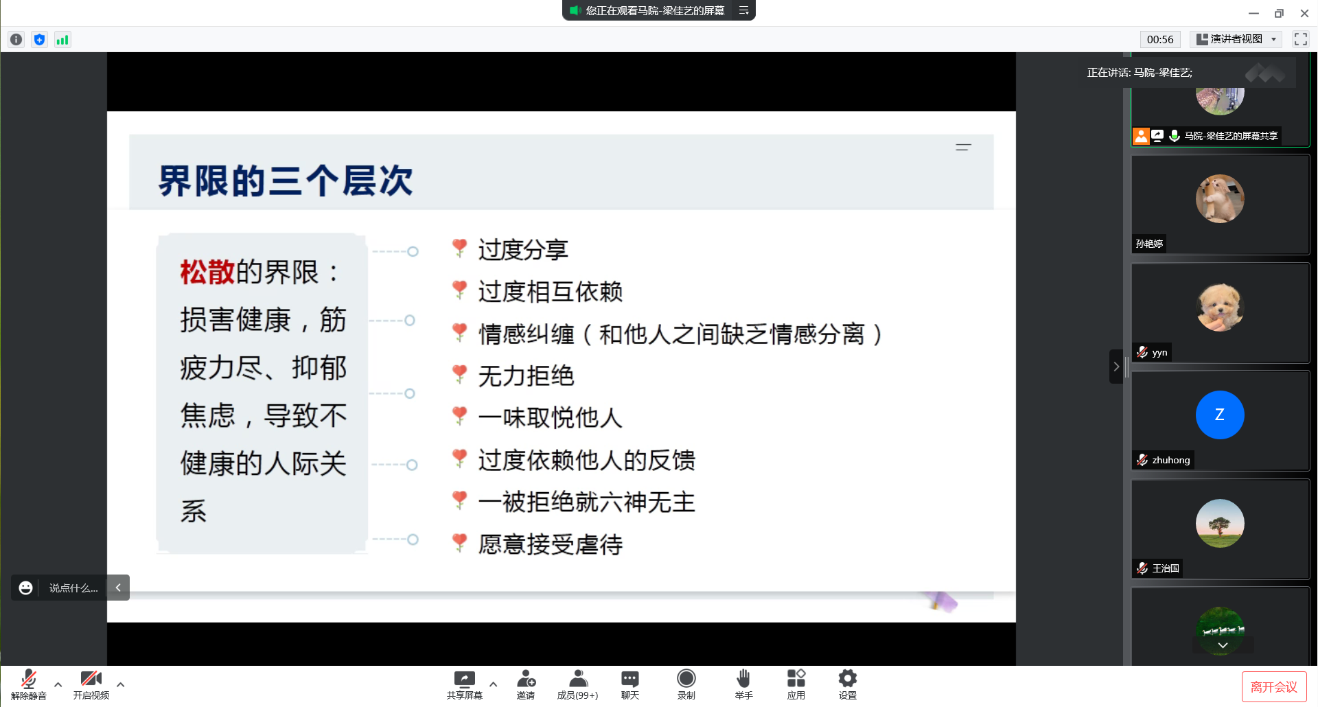 “缺乏人际界限”是钱老师反复强调的问题,在人际交往中,同学们面对的多数困扰包括无法拒绝、人际冲突、缺乏安全感、不会表达等等,这些都是由缺乏人际界限产生的困境,老师表示“界限帮助我们在人际关系中体验到安全与舒适的预期与需求”,并结合生活中的案例详细讲述了关于界限建立的各类话题,如根据界限的三个层次培养彼此间的界限感、无法成功表达界限的四种方式、如何成功表达自己的边界、不为对方道歉、如何与难缠的人设定界限等等,并通过小练习与小测试让同学们感受边界感的正常范围。