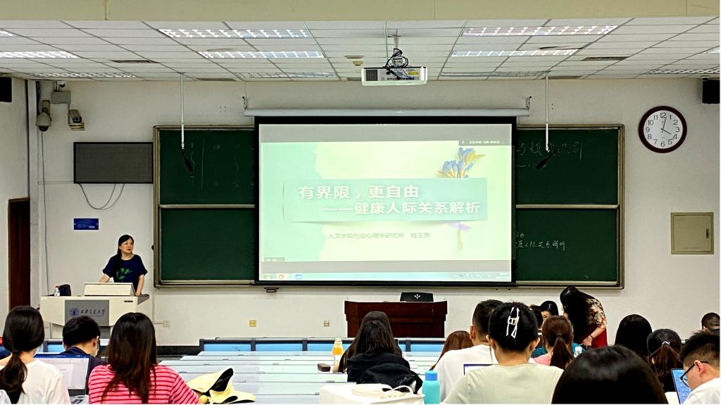 人文学院社会心理学研究所钱玉燕副教授,围绕“如何建构一个健康的人际关系”就人际交往的必要性、怎样相互吸引、什么样的人际关系更健康、如何增强自我吸引力等问题详细为同学们阐释说明。
