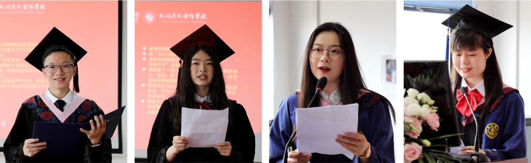 本科毕业生代表吴安国同学、刘安然同学发言,硕士毕业生代表李佳欣、张杨一同学发言,大家表达了对母校和老师的感谢,讲述了在交大成长和奋斗的历程,表示无论未来在哪里,都将继续践行“精勤求学、敦笃励志、果毅力行、忠恕任事”的校训与勤朴踏实的作风,以实干成就光明未来,用奋斗当为世界之光,也为学校、老师和全体毕业生们送上了最美好的祝愿。