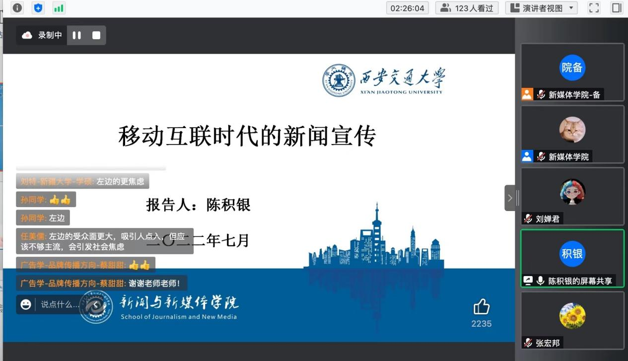 随后,刘斌老师、刘婵君副教授、陈积银教授三位老师先后从疫情案例中的新闻采写编、中国主流媒体建设性新闻实践和移动互联时代的信息传播等方面进行了精彩的专题讲座,带领营员们近距离感受学院老师的学术研究魅力,激发大家的学术研究兴趣。