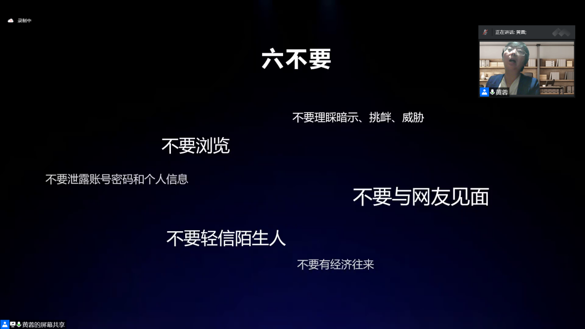 第四是网络社交重重问题与在线安全社交之间的矛盾。网络社交已经成为当前青少年交友的重要途径之一,但是网络社交存在着隐私泄露、不安全、语言暴力等种种隐患,因此,在网络上进行安全社交是必须重视的问题。对此,黄蓉老师指出,儿童与青少年在进行线上社交时,应当做到“六不要”,不要理睬暗示、挑衅和威胁信息、不要浏览不安全的网页、不要泄露账号密码和个人信息、不要与网友见面、不要轻信陌生人、不要与对方有经济往来。