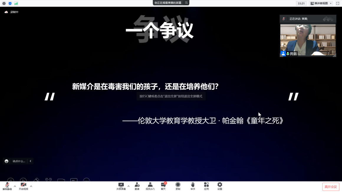 网络是把双刃剑。有人认为媒介有益于孩子,要利用好新媒体。也有人指出,媒介会毒害儿童,应当合理使用网络。针对这些观点,黄蓉老师引用著名教育学家马克·普伦斯基的话,“与数字媒体共同成长的一代被称为‘数字原住民’,他们一定与他们的父辈——‘数字移民’拥有不同的童年,有着不同的媒介使用方式”。因此,重点不是争论媒介的利弊,而是如何使用好媒介,将儿童与青少年培养成合格的数字公民。