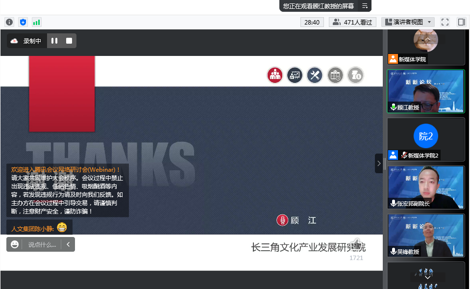 吴锋教授,两位专家围绕文化产业领域的前沿问题分别以“5G时代数字文化产业的商业模式创新:案例与思考”与“文化产业领域人工智能主播应用现状、盈利模式及发展前瞻”为主题开展了精彩讲座。论坛由91传媒