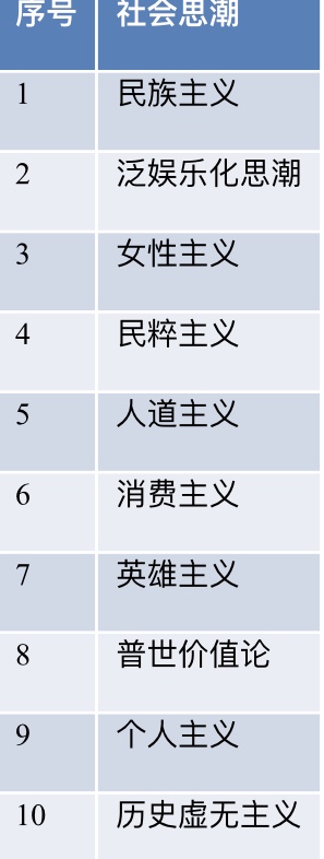 根据研究报告所得出的新媒体传播影响力排行榜,2021年中国十大社会思潮依次为:民族主义思潮、泛娱乐化思潮、女性主义思潮、民粹主义思潮、人道主义思潮、消费主义思潮、英雄主义思潮、“普世价值”思潮、个人主义思潮、历史虚无主义思潮。