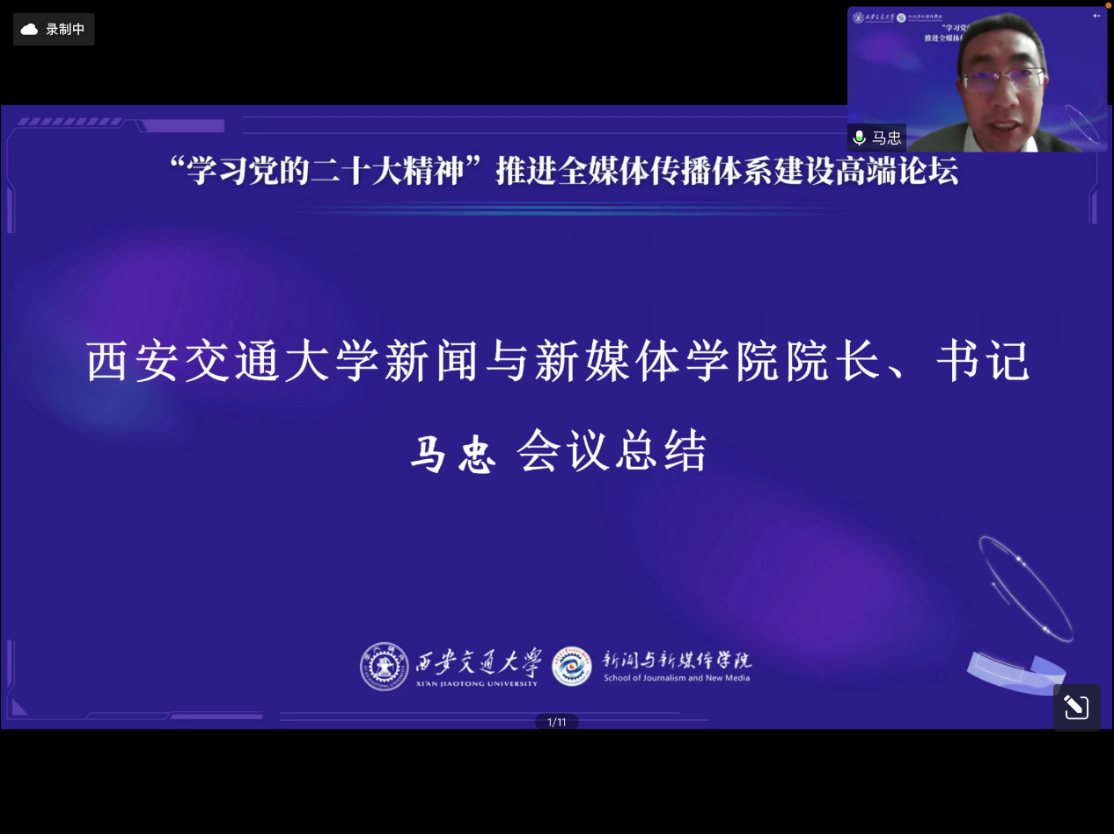 马忠院长做论坛总结。他指出:各位专家的报告回答了全媒体体系建设的内涵问题,指出了全媒体体系是中国式现代化的应有之义,是媒体融合的进阶阶段,是技术发展的必然产物,更是人的现代化的必由之路。同时,各位专家的报告也试图从媒体融合、全媒体策略、互联网治理、人才培养等不同侧面回答全媒体体系“如何建设”的问题。相信通过全国新闻传播学院院长代表们的分享一定会引来政产学研有关全媒体体系建设的深入思考,也必将对加快全媒体传播体系建设,提振全媒体传播效能,培养适应新时代全媒体传播需要的人才队伍带来深远影响。