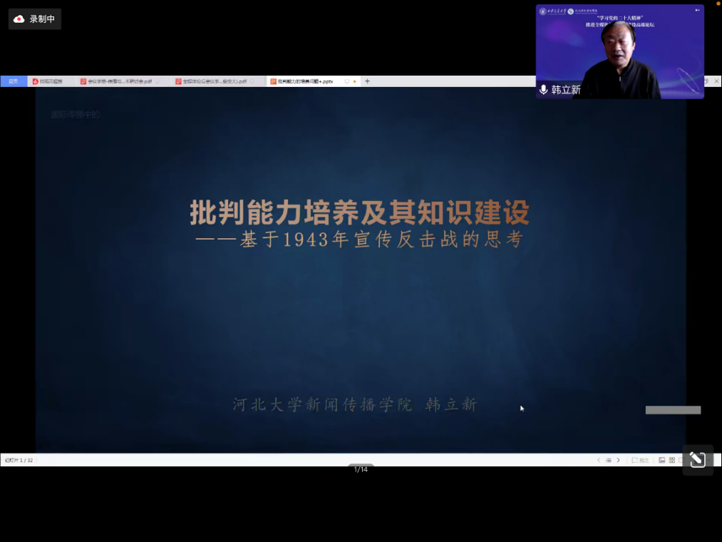 河北大学新闻传播学院院长韩立新教授作了题为“批判能力培养及其知识建设——基于1943年宣传反击战的思考”的主题演讲。他以“阿世的技艺化倾向”解构当下舆论动向,从对大众媒体的批判切入,指出要把握好“批判这一战胜风险和对抗性实力的方法和力量”。推动对中国共产党新闻史的深入研究、中国式现代化与国际交往的融合、坚持“和文化”与“科学原则”,加快批判能力培养及其知识建设。