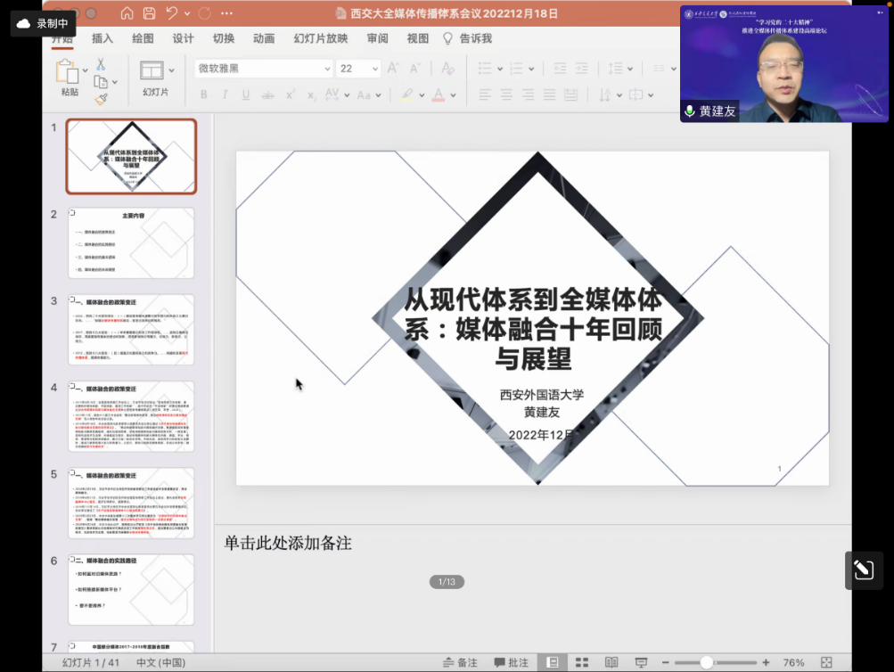 西安外国语大学新闻与传播学院院长黄建友教授的分享围绕“从现代体系到全媒体体系:媒介融合十年回顾”展开。他分析了近十年间媒体融合政策变迁,总结出媒体融合在内容、平台、资本的三大总体取向。并以央媒、上报集团等为为例总结了不同媒体融合实践路径,并指出:中国媒体应在聚焦新闻主业、多元化经营等不同方面形成自己的媒体融合之路。
