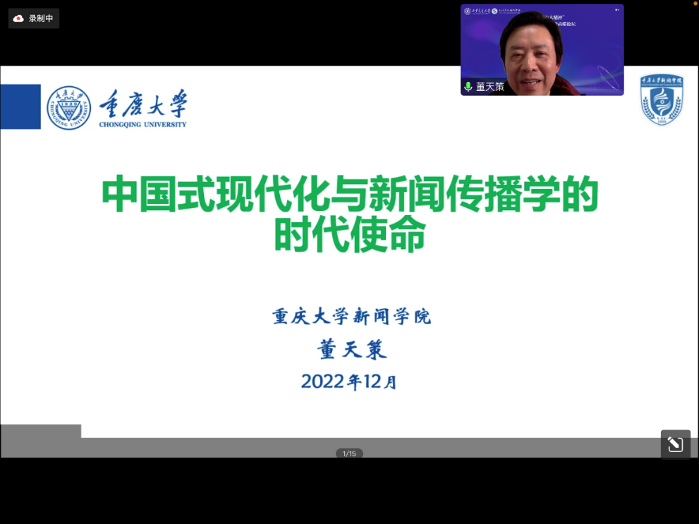 重庆大学新闻学院院长董天策的演讲主题为“中国式现代化与新闻传播学的时代使命”。他认为,现代化建设要“以人为本”,新闻传播学科面对学科交叉与融合发展的基本生态,肩负着创新的时代使命。倡导多元范式与多元进路,