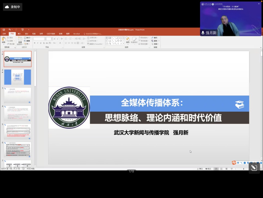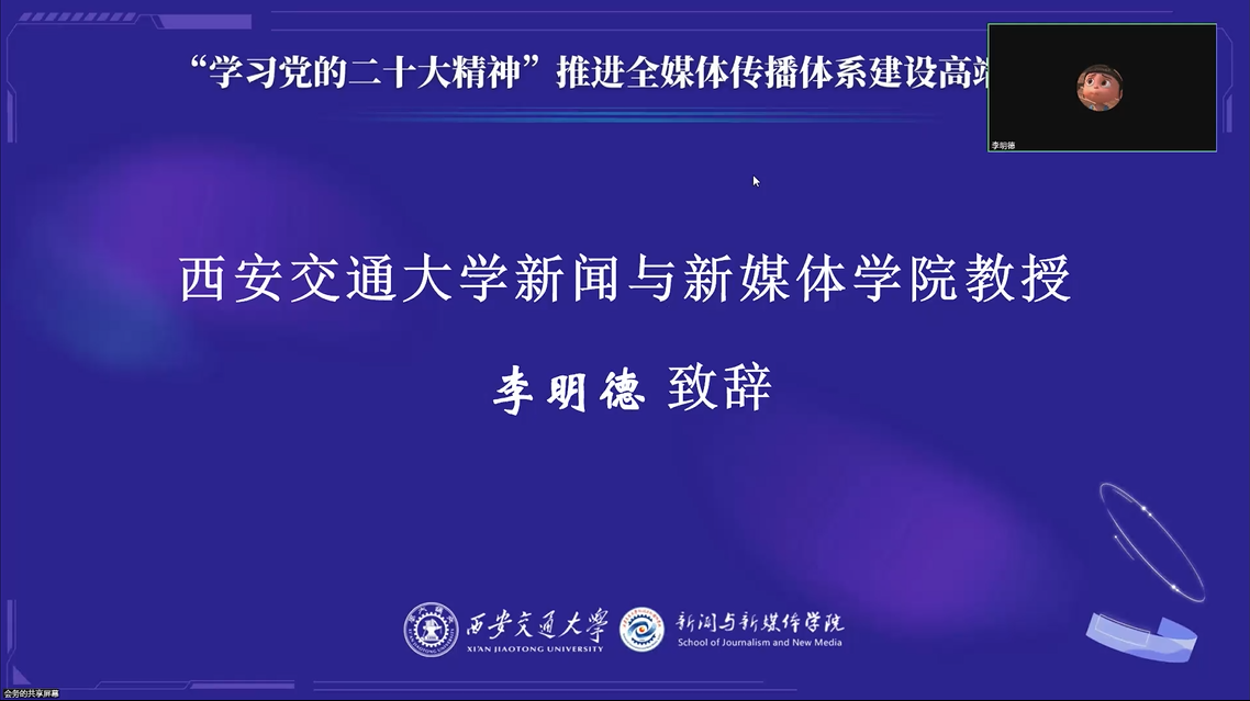 武汉大学新闻与传播学院院长强月新教授的分享主题为“全媒体传播体系:思想脉络、理论内涵和时代价值”。强月新教授认为:现代传播体系到全媒体传播体系的转型意味着传播能力提升与传播关系要不断调适。他同时指出:丰富和发展马克思主义新闻观、推动全媒体时代下的媒体深度融合、促进社会转型和推进国家治理现代化是全媒体传播体系建设的三大时代价值。