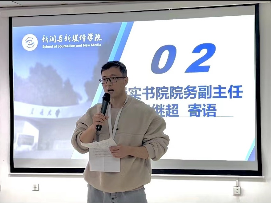 张宏邦副院长首先向大家传达了近期教学领域的喜讯,“网络与新媒体”本科专业获批国家一流专业建设点,《传播学引论(修订版)》荣获陕西省2022年职业教育和高等教育优秀教材奖特等奖。随后以“自信,自强,自律”三个关键词为主题展开,寄语大家“要对自己的学校、专业保持自信”并且要“相信自身实力、拥有伟大抱负”,他强调作为新媒体专业的学生,要担当起“讲好自己,国家,学科故事”的民族大任,同时坚持自律,才能实现理想。