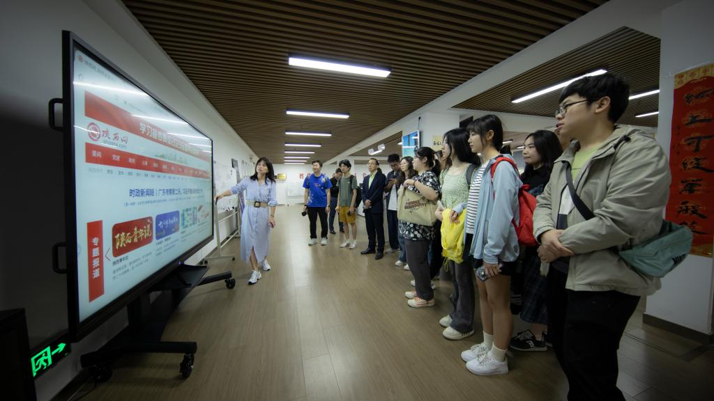 师生首先观看了陕西网围绕建党百年、乡村振兴、二十大精神宣传等主题策划制作的新闻宣传作品。随后,同学们结合参观感受与专业所学,就新闻选题策划、个人专业技能提升、假期实习实践等与陕西网三位部门负责人交流。受乡村振兴短视频作品《归雁》启发,新媒体2101班靳天阳同学说陕西网的很多新闻报道将典型人物故事置于宏大时代背景下,进行创新叙事,如《微光》摄影作品栏目记录了西安城里在各自岗位上默默耕耘的平凡的工作者。新媒体2101班钱子懿同学说《党史可以这么学》系列展现出党史教育的趣味性,《数据陕西》则用数据可视化的形式生动呈现了陕西各方面的发展进步,这些创新的优秀作品让他对主题新闻宣传有了更全面的理解。