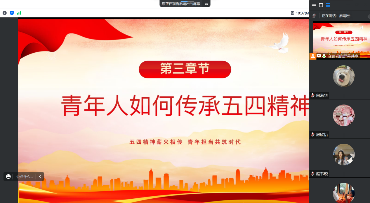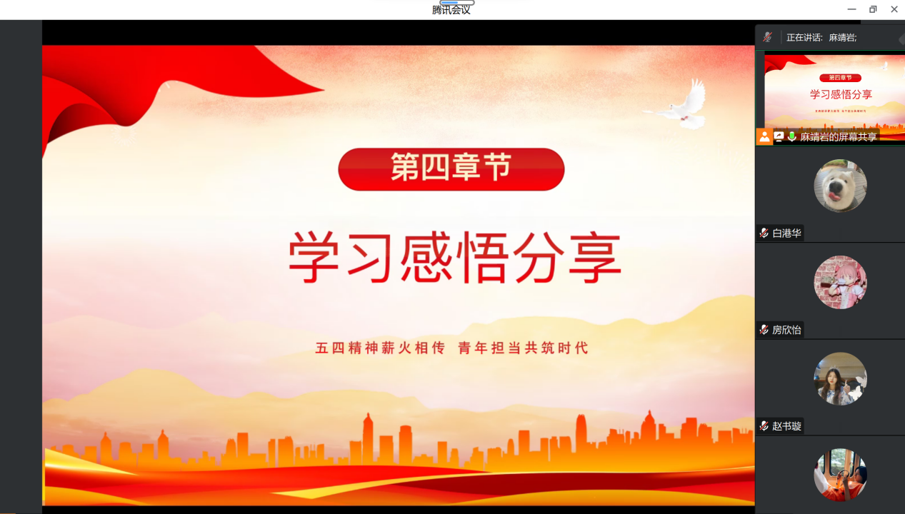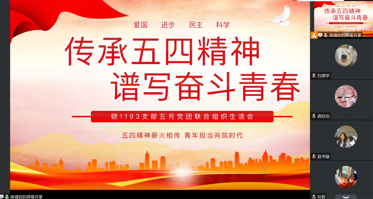 习近平总书记五四重要回信在各级共青团组织中引发了热烈反响,极大鼓舞和振奋了全国广大青年和青年工作者,为了纪念和发扬“五四”的革命精神与光荣传统,学习习近平总书记重要回信精神,5月28日晚,硕1193党支部召开以“传承五四精神,谱写奋斗青春”为主题的5月党团联合线上组织生活会,在会议学习过程中同学们对于自己作为新时代交大青年传承五四精神的责任感和使命感有了更深刻的认识和理解。硕1193班团支书麻靖岩主持此次会议。