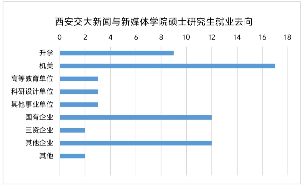 共有63名硕士毕业生。就业去向覆盖升学读博、党政机关、高等教育单位、科研设计单位、其他事业单位、国有企业、三资企业及其他企业,大多数毕业生从事新闻传播相关“对口”专业工作。其中,升学继续攻读博士学位的9人,主要包括中国人民大学、复旦大学、91传媒
