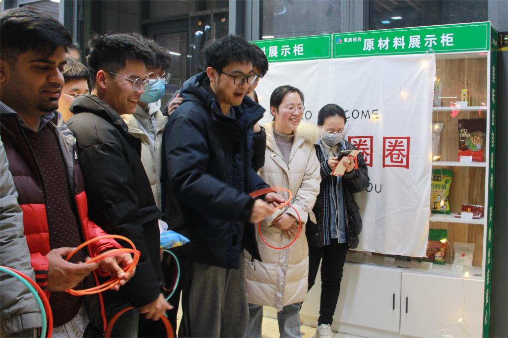 活动于12月29日晚在创新港C区食堂朗苑举行,活动游戏吸引了众多同学和留学生的参与。现场热闹非凡,欢声笑语不断。活动以趣味套圈为主线,参与者需按照规则在指定区域内投掷套圈,圈中目标即可获得相应奖品。为了增加活动的趣味性,现场还设置了多个西迁精神的节点展示,让同学们在游戏中了解交大的历史与文化。