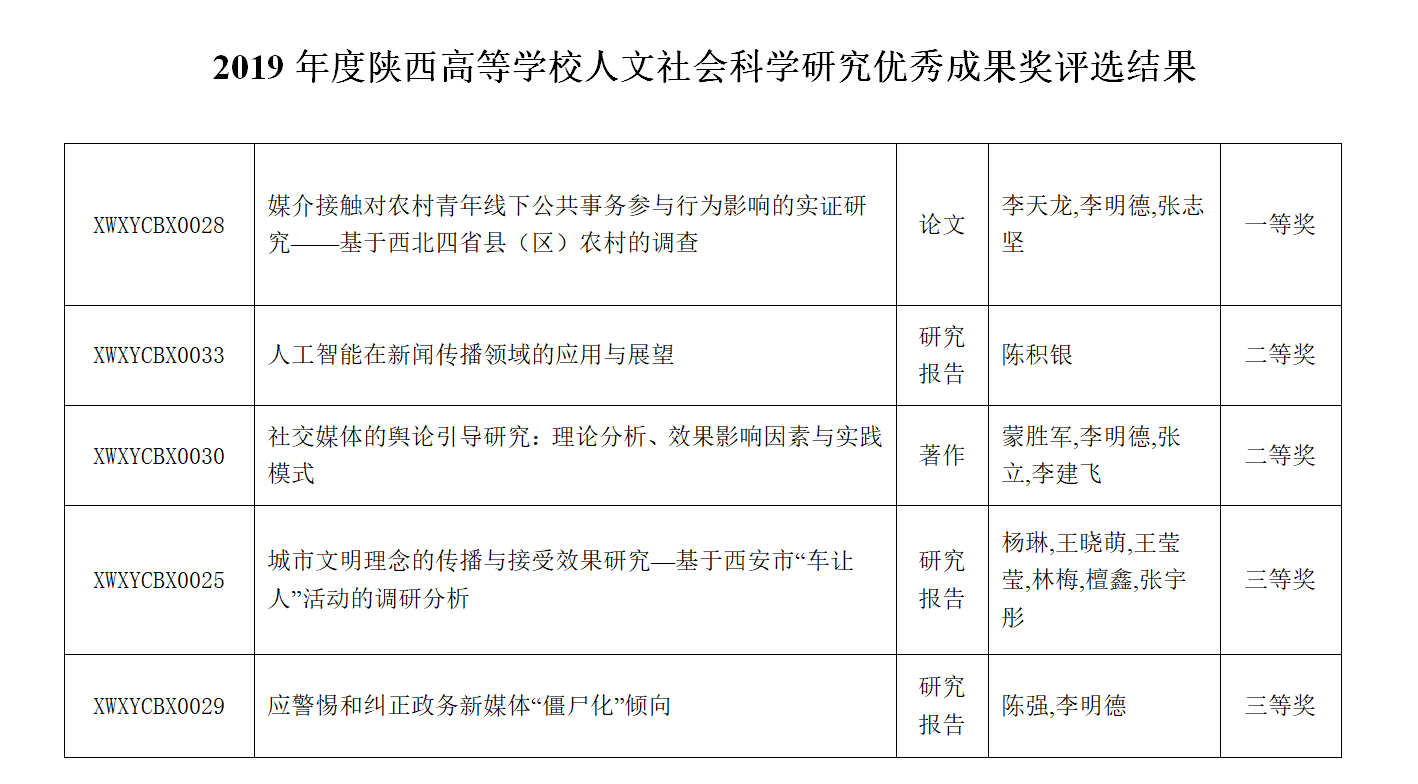 近日,2019年度陕西高校人文社会科学优秀成果奖揭晓,我院李明德教授等申报的论文媒介接触对农村青年线下公共事务参与行为影响的实证研究——基于西北四省县(区)农村的调查”获得一等奖陈积银教授申报的研究报告“人工智能在新闻传播领域的应用与展望”蒙胜军老师等申报的著作“社交媒体的舆论引导研究:理论分析、效果影响因素与实践模式”获得二等奖;杨琳教授等申报的研究报告“城市文明理念的传播与接受效果研究—基于西安市‘车让人活动的调研分析陈强副教授等申报的研究报告“应警惕和纠正政务新媒体‘僵尸化’倾向”获得三等奖