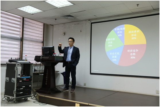 吴教授认为,关于美国对华看法,民意有五大核心要素和一种外在诱因:政治意识形态、经济竞争态势、社会文化因素、宗教信仰因素及军事地缘政治,这五项要素各占25%、30%、15%、20%、10%,这是基本的量化的质化分析;而外在诱因则是媒体,媒体是催化剂、放大镜和扩音器,且与前面的五大核心因素有机粘连,很难剥离区分。吴旭教授分别就这几项影响因素通过具体的数据分析以及视频展示进行了解释。