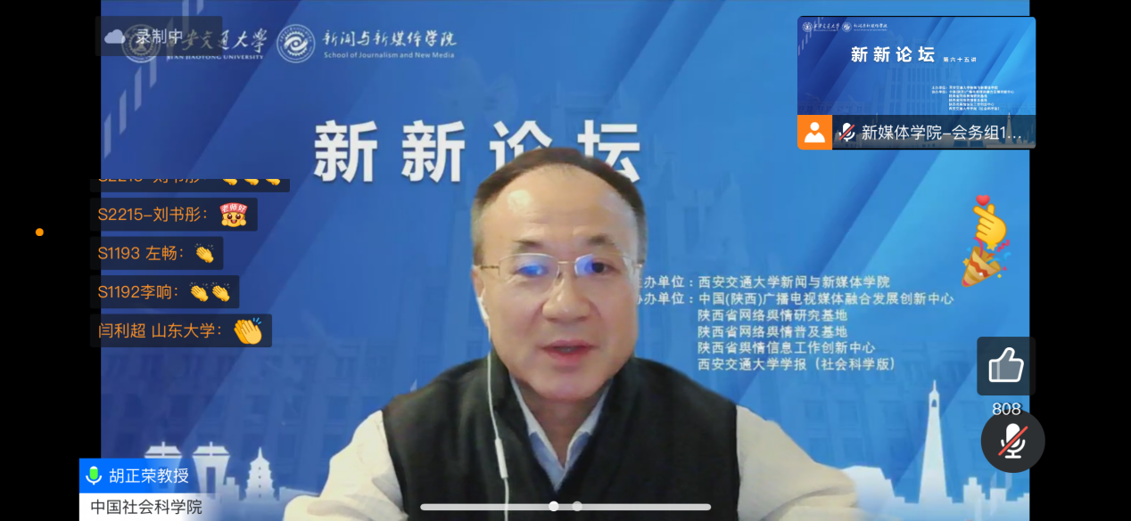 2022年12月9日下午,新新论坛第六十五讲在腾讯会议线上顺利举行。本次新新论坛特别邀请到了中国社会科学院大学胡正荣教授和91传媒
