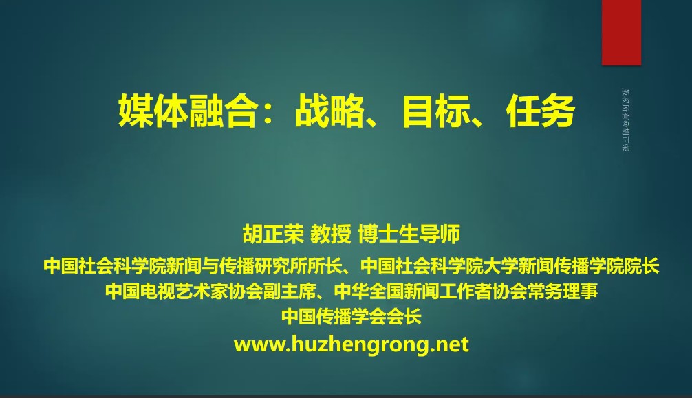 胡正荣教授以“媒体融合:战略、目标、任务”为题,从战略、目标、任务三个角度展开介绍媒体融合及智慧全媒体传播体系,通过深入分析四份相关文件,指出媒体融合仍是未来媒体的焦点、热点、难点。由此也提出加快推进媒体融合向纵深发展,需要紧握两个抓手,三个任务,最后实现“牢牢占据舆论引导、思想引领、文化传承、服务人民的传播制高点”目标,并总结性地道出中国式媒体融合的基本思路和路径:中央大力推进媒体融合,目的是打造覆盖全国范围的全媒体传播体系,进而助力国家政治治理。
