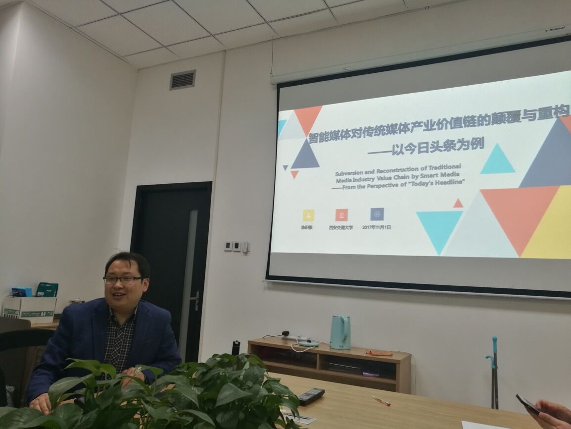 随后师生们就当下传媒发展的现状与问题展开了激烈的讨论,陕西电视台媒体从业者、学院博士生张收鹏对传媒产业的发展表达了自己的看法,学院硕士研究生吴愿晶、葛宇也同在座师生分享了他们关于今日头条算法团队、运营团队以及精选内容原则的观点,以及自己对媒体产业链的相关见解。