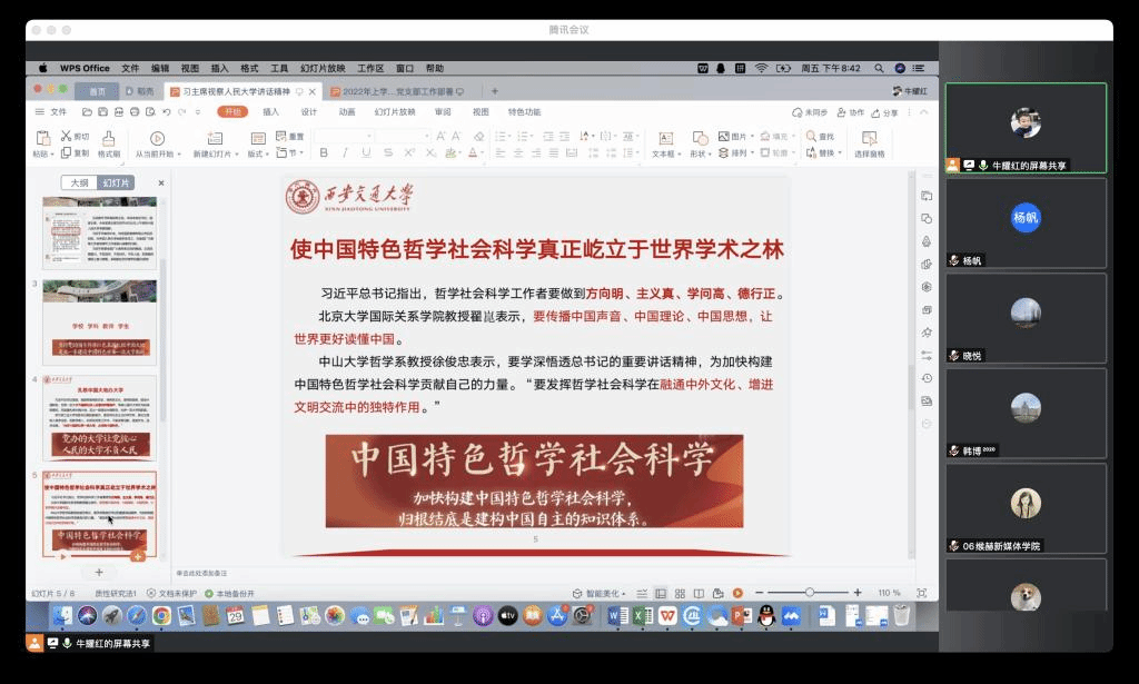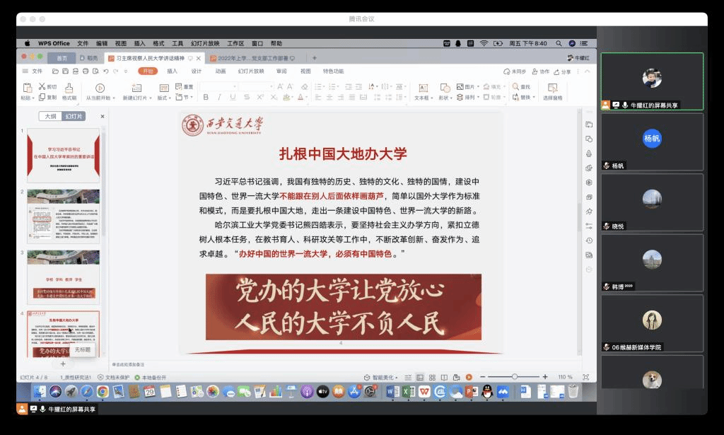 牛耀红指出,五四青年节到来之际,习近平总书记考察中国人民大学,并向全国各族青年致以节日祝贺,对当代青年提出殷切期望和明确要求。近期,习近平总书记还给北京科技大学老教授回信,这充分体现了以习近平同志为核心的党中央对教育事业的高度重视。习近平总书记的重要讲话着眼抓好党的事业后继有人这个根本大计,强调高等教育要坚持党的领导,坚持马克思主义指导地位,坚持为党和人民服务,落实立德树人根本任务,传承红色基因,扎根中国大地办大学,走出一条建设中国特色、世界一流大学的新路,为推进高等教育高质量发展指明了方向。因此,新媒体系党支部要切实把思想和行动统一到习近平总书记重要讲话精神上来,围绕如何创建具有中国特色的新闻传播学进行思考和讨论。