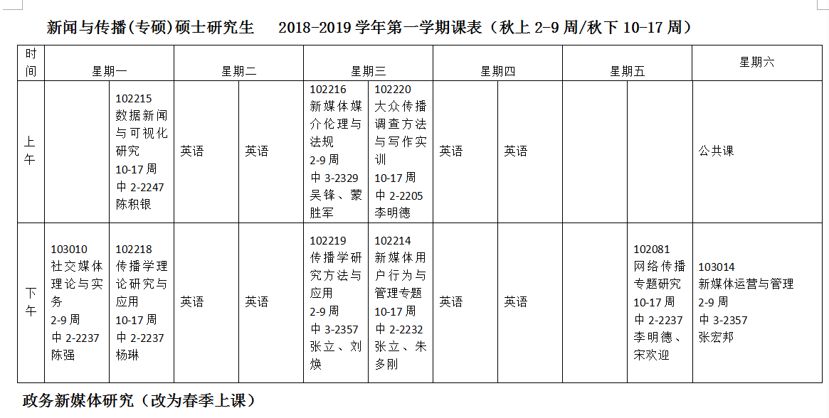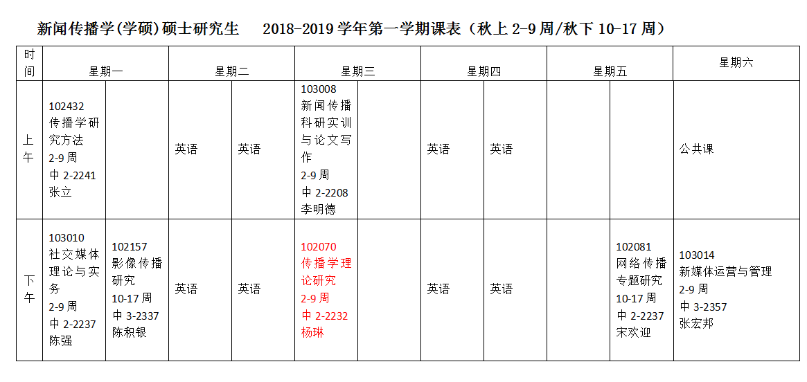 2018-2019学年第一学期课表