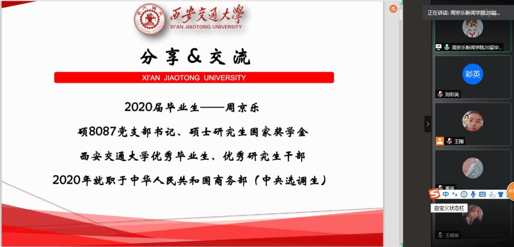 硕9178党支部举办以“发挥党员传帮带作用,助力毕业班同学就业”为主题的组织生活会暨就业分享会。以党支部为桥梁为全体支部成员提供交流平台,贴近学生实际关切,鼓励毕业生将小我融入大我,实现个人职业发展与社会发展的紧密连接。本次线上分享会由硕9178党支部书记姬贝贝主持,原91传媒