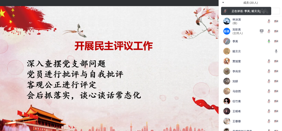 硕9178党支部全体成员于线上召开了2020年度组织生活会暨民主评议党员会。会议由党支部书记姬贝贝主持。