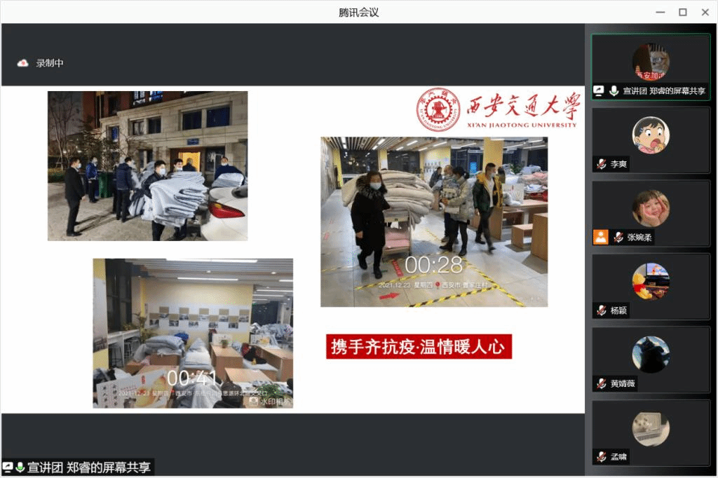 微宣讲团的郑睿同学,以“携手共抗疫,交大勇担当”为主要内容,郑睿同学结合西迁精神展开了声情并茂的主题演讲。支部成员依次分享交流抗疫过程中所见所学,采用线上的方式,召开了这场特殊的组织生活会。
